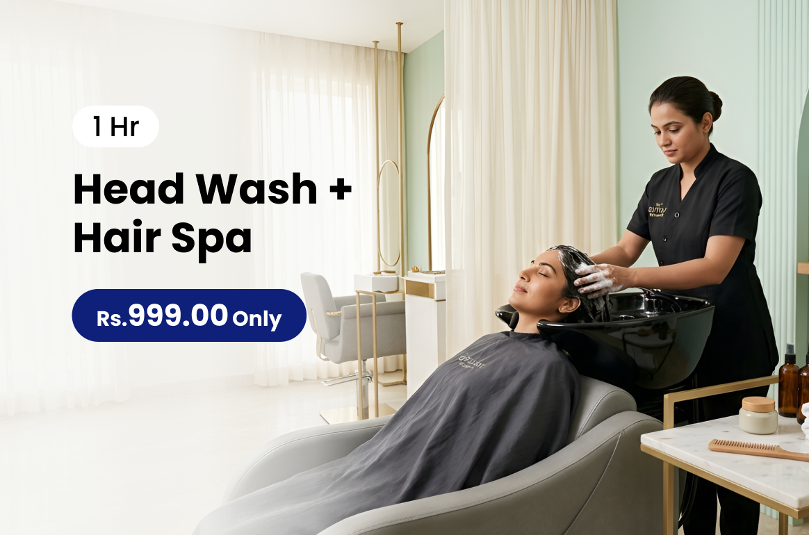 Head wash with a hair spa deeply cleanses and nourishes the scalp leaving your hair soft refreshed and revitalized.