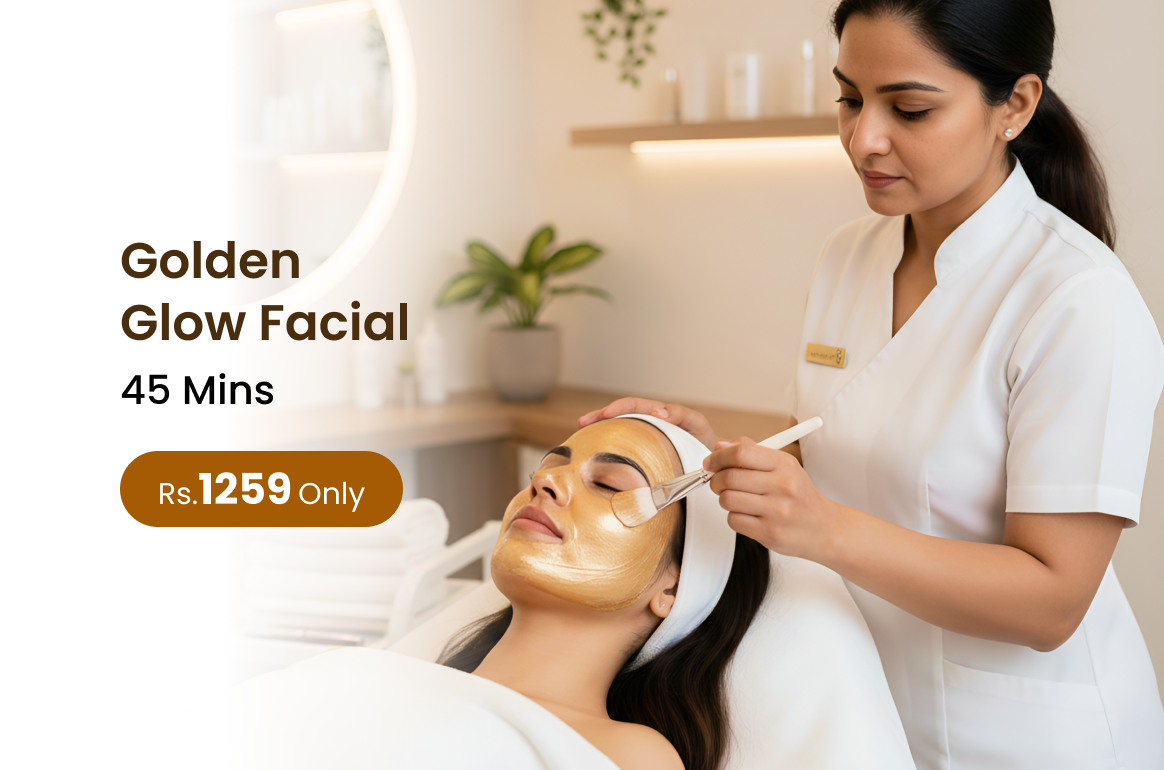 Golden Glow Facial rejuvenates the skin by enhancing natural radiance improving texture and leaving the face refreshed smooth and luminous.